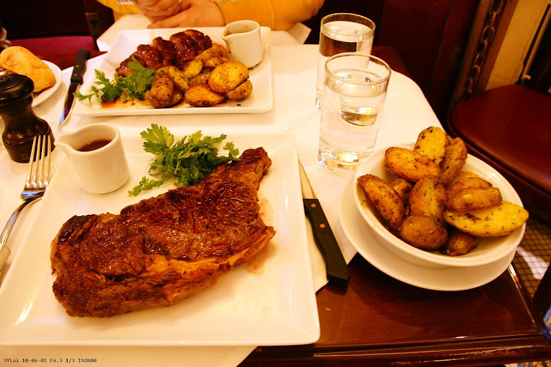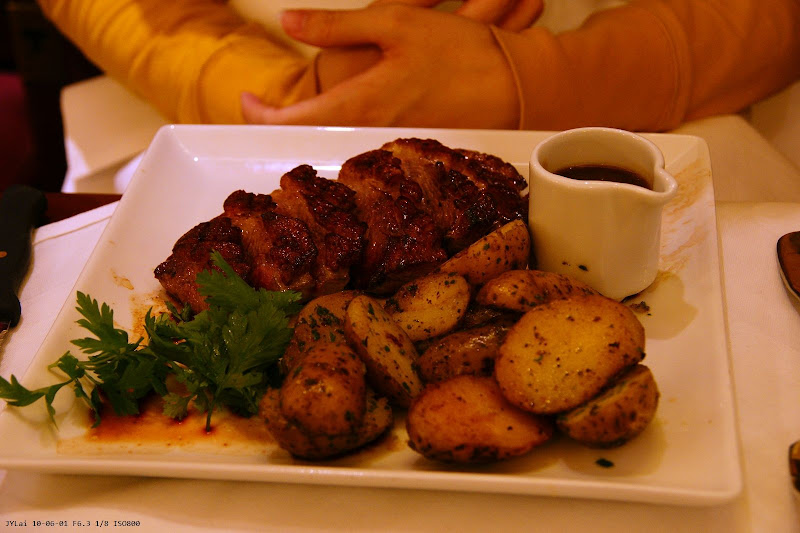 在國外吃牛排,都是像這樣一塊純粹的牛排放在瓷盤上,不像在台灣幾乎都會再淋上一堆醬汁,或許這樣比較吃得出原味。